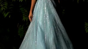 Cut from layered glitter tulle, this dress features radiating linear platinum beading throughout, a plunging back and voluminous skirt for a dramatic entrance. Horsehair trim stabilizes the hemline.