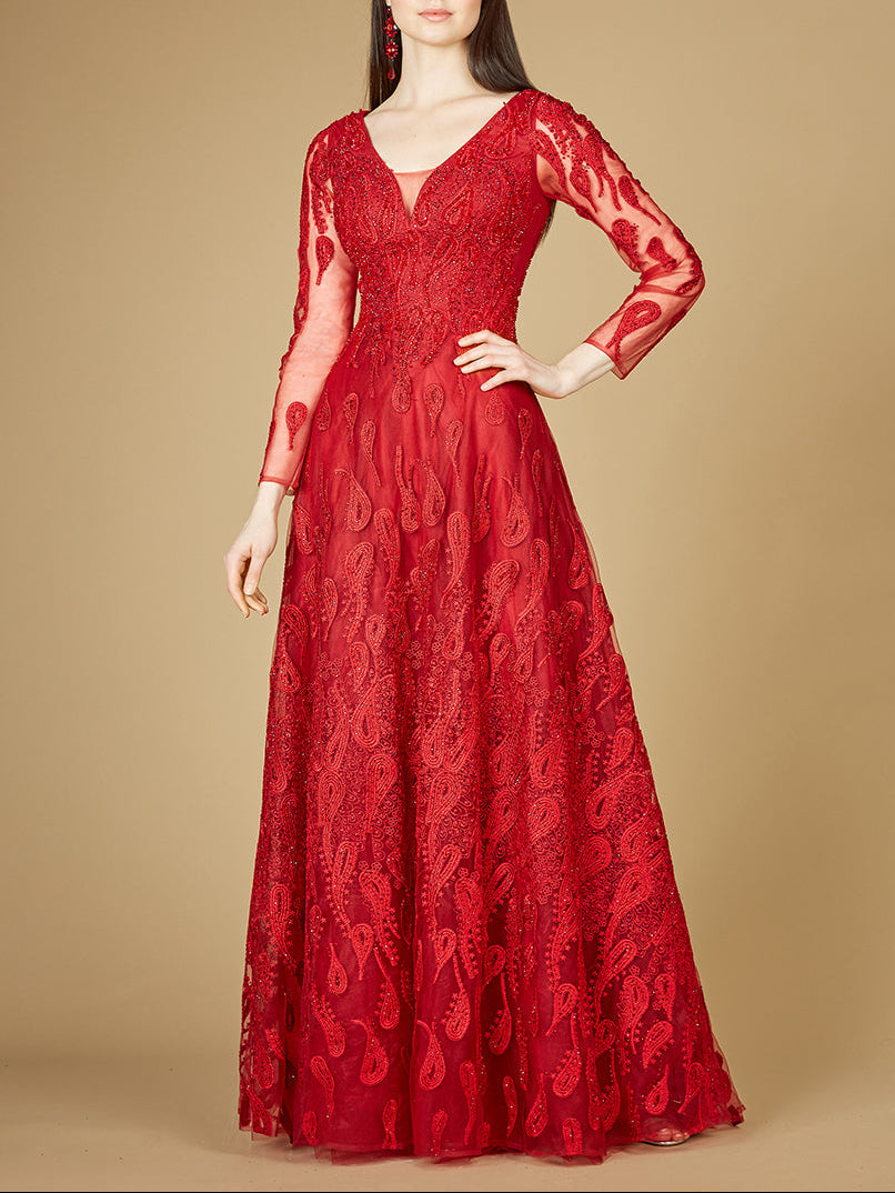 Lailah Modest Long Drape Sleeves Beaded Red Gown
