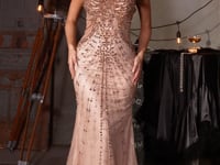 - Fabric & Material: Fully beaded tulle overlay with nude lining